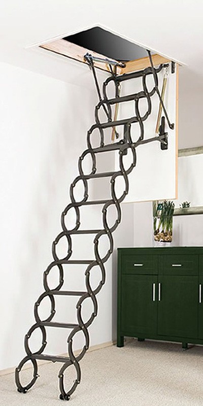 Metalne tavanske merdevine sa sistemom sklapanja ‘Makaze’. Kada su sklopljene skrivene su u područje plafona tako da ne zauzimaju prostor.